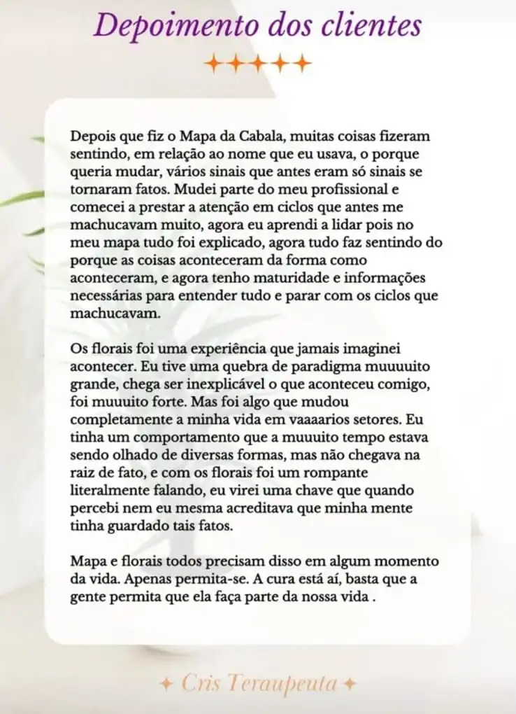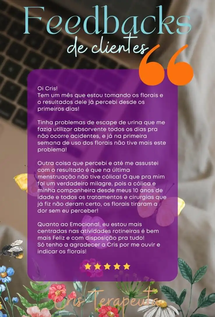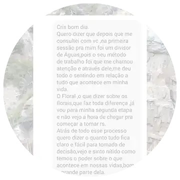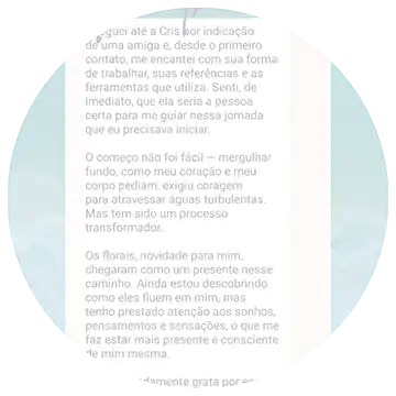Minha experiência com a Cris foi profunda e transformadora. O processo com os florais foi um divisor de águas no meu bem-estar emocional. Sou muito grata por todo o cuidado e pela sensibilidade. | ❤️1