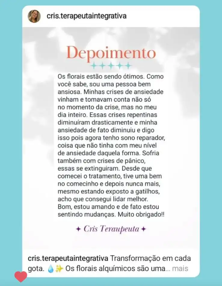 Foi muito importante para mim a terapia de floraes, um momento de virada de chave onde consegui buscar muitas respostas e orientações para seguir minhas escolhas e dar um direcionamento para o que realmente importa na minha vida. Curar nossas feridas nem sempre é fácil, mas a Cris com sua ternura e dinâmica soube bem me orientar. | ❤️1